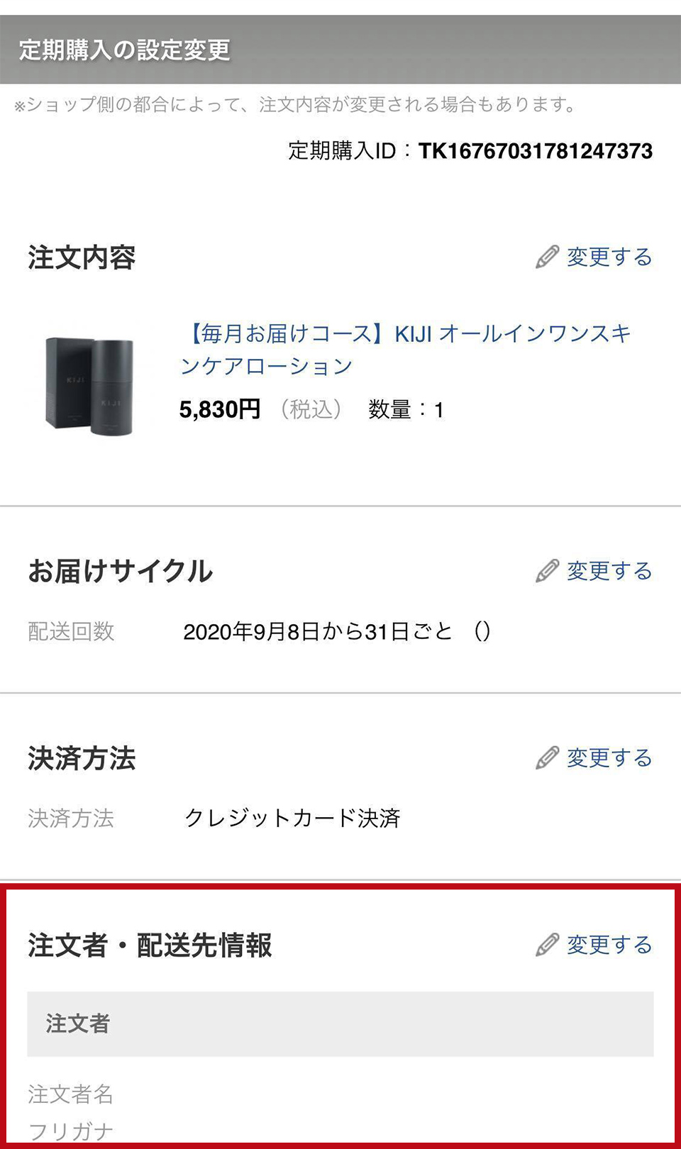 なお、「定期購入の設定変更」画面下部のお届け予定一覧で「確定済み」となっている配送のご変更はできかねますので、次回以降からの変更となります。お急ぎの場合は直接カスタマーセンターまでご連絡ください。
